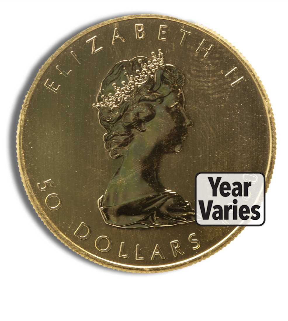 1 oz Canadian Gold Maple Leaf coins, minted by the Royal Canadian Mint, are .9999 pure (24 K) gold, contain exactly 1 troy ounce (31.11 g) of gold, feature the iconic maple leaf design on the reverse, and carry a $50 CAD face value—all in secure, original mint packaging.